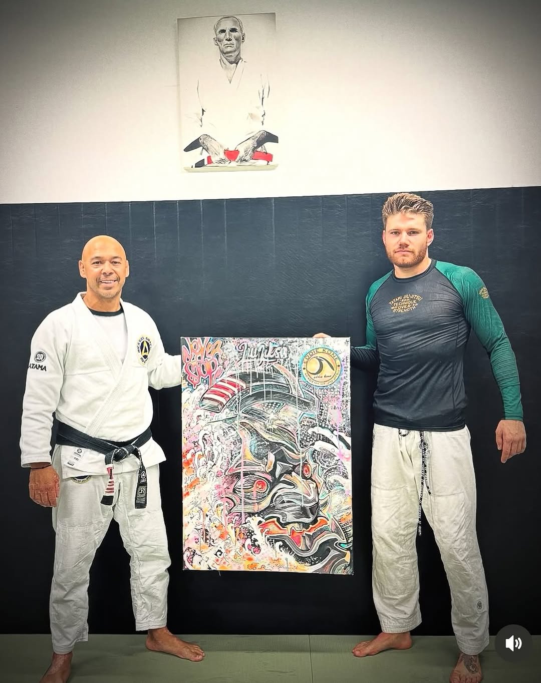 Professor Eddie Kone, a Brazilian Jiu-Jitsu black belt under Royler Gracie, is a renowned coach dedicated to preserving the Gracie legacy. As head of the Eddie Kone Academy, he teaches authentic Jiu-Jitsu and values like discipline and respect. A former MMA competitor, he brings real-world experience to his students while inspiring confidence, growth, and a true Jiu-Jitsu lifestyle. This artwork honors his commitment to the art and community.